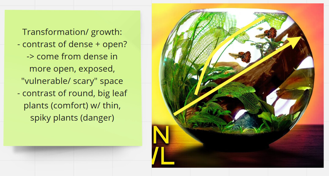 And here is how that narrative (of transformation/ change) is supported by the foliage:Also I was so happy to find that image on the right! It was so hard to find any aquariums with a composition that reads well as a 2D image.